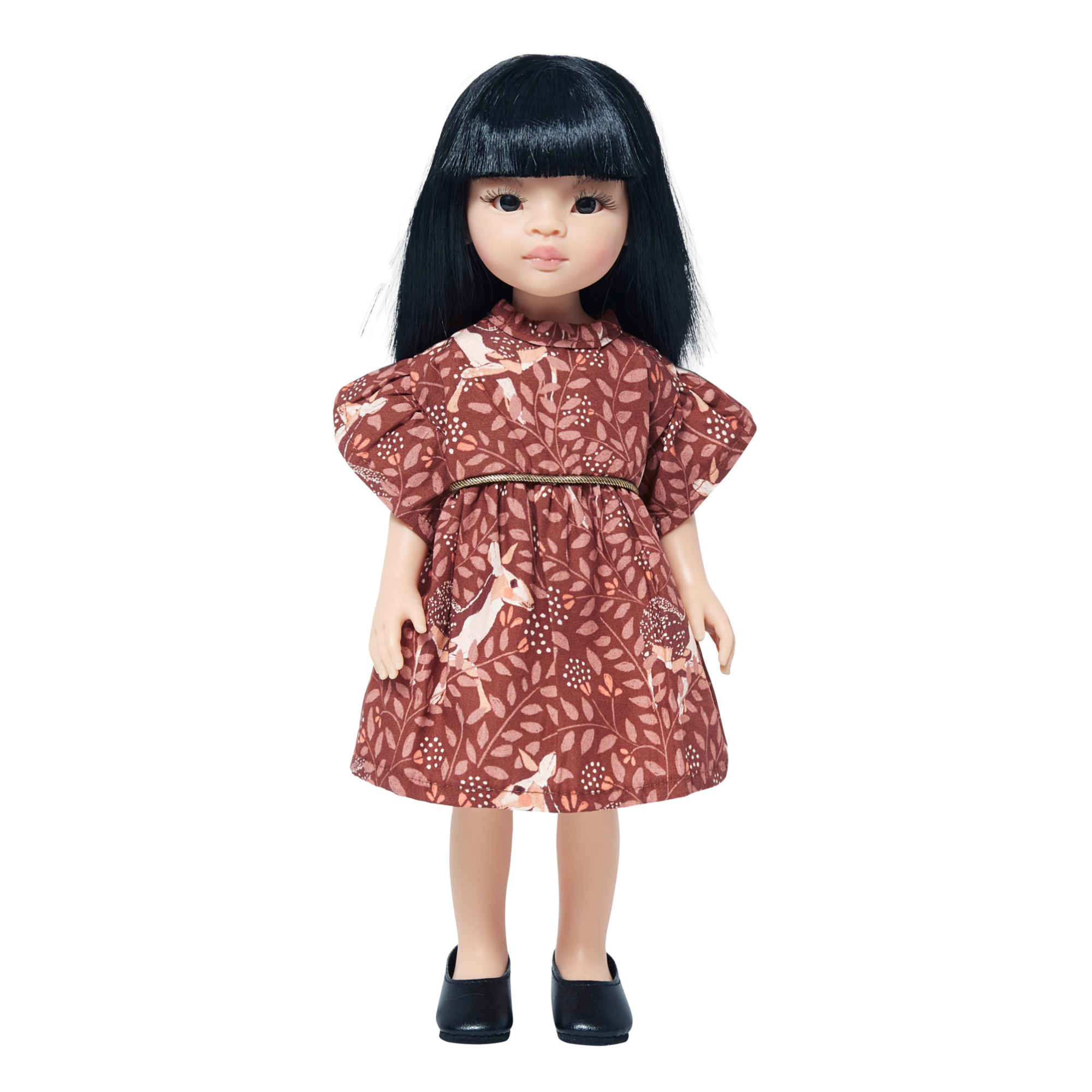 • Poupée brune, Peau claire, Cheveux longs avec frange implantés à la main, Yeux fixes avec cils et sourcils peints.